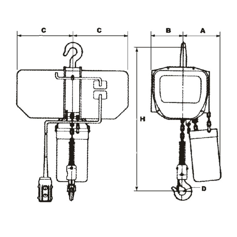 | Model | Capacity (ton) | Lift (M) | Hoisting Speed (m/min) | Hoisting Motor (kw) | Chain Dia. *Pitch | Chain Falls Line | Control Voltage | Power Source | Min. Raidus Curvature(m) | Approx. Weight(kg) | ||