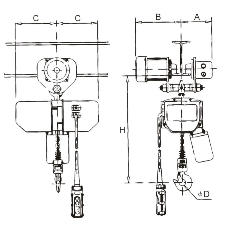| Model | Capacity (ton) | Lift (M) | Hoisting Speed (m/min) | Hoisting Motor (kw) | Traversing Speed (m/min) | Traversing Motor (kw) | Chain Dia. *Pitch-No. | Control Falls Line | Control Voltage | Power Source | Standord | Min. Raidus Curvature(m) | Approx. Weight(kg) | |||||||||||||||