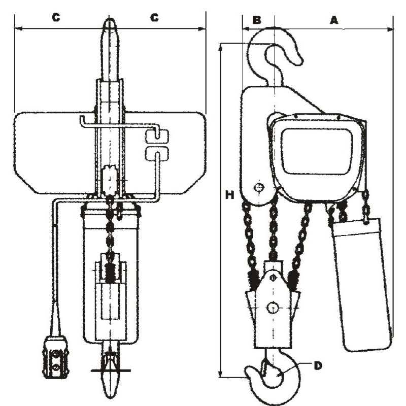 | Model | Capacity (ton) | Lift (M) | Hoisting Speed (m/min) | Hoisting Motor (kw) | Chain Dia. *Pitch | Chain Falls Line | Control Voltage | Power Source | Min. Raidus Curvature(m) | Approx. Weight(kg) | ||