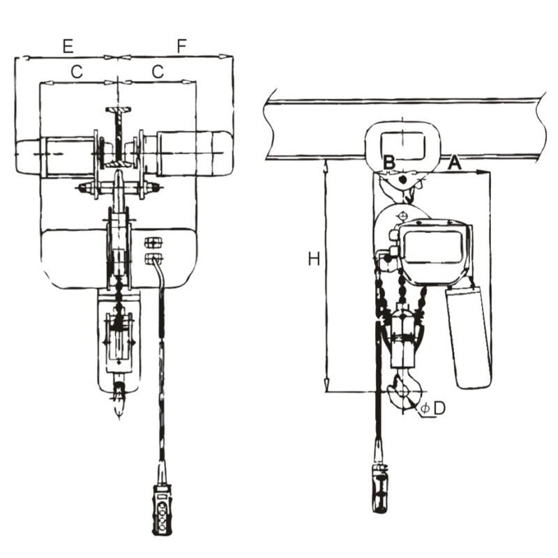 | Model | Capacity (ton) | Lift (M) | Hoisting Speed (m/min) | Hoisting Motor (kw) | Traversing Speed (m/min) | Traversing Motor (kw) | Chain Dia. *Pitch-No. | Control Falls Line | Control Voltage | Power Source | Standord | Min. Raidus Curvature(m) | Approx. Weight(kg) | |||||||||||||||