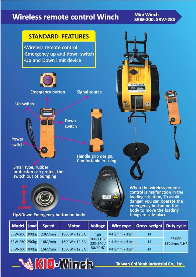 | SRW-200 | 200kg | 23M/min | 1500W x 12.5A | 1ph 100-115V / 220-240V 50/60HZ |